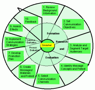 From the March-April 1993, Vol. 106, No. 2 181 publication"Policy", this article entitled "Health Communication Takes on New Dimensions at CDC" of Dr. William L. Roper, of the Centers for Disease Control and Prevention (CDC), United States, describes the health communication wheel: "For implementing health communication programs at CDC, there is a framework based on 10 action steps. These 10 steps, depicted in the chart, follow: