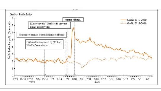 - Public responses to rumours and misinformation on remedies - sample finding: A rumour that garlic could prevent COVID-19 started to spread on January 21 2020, and the Baidu Index of garlic increased accordingly. This index reached a peak on January 27 2020 and declined after January 28 2020, when People's Daily first refuted rumours about the protective function of garlic. Likewise, public searches for chloroquine and hydroxychloroquine peaked on March 20 2020 after United States (US) President Donald Trump's initial public remarks on the drugs at a briefing on March 19 2020; this increase was observed in all countries.