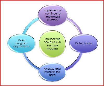 - Continue the monitoring and evaluation process - "The frequency of monitoring (continued collection, analysis, and interpretation of key indicators) will depend on the nature of the scale-up and practice of interest, the type of the question of interest, and resources - both financial and human."