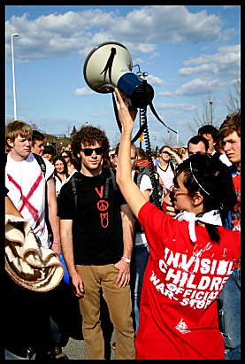 The Invisible Children website provides information about how to access the film, as well as a variety of multimedia materials and ways to learn from and connect with others taking action. There, one is encouraged to "Set up an Invisible Children club. Act as the leader, overseer, motivator, lighthouse. Develop your vision of how to help these children and people will follow your guiding light. Lead them well....Use your time and talent to find creative ways to raise awareness." One can book "roadies" who will visit and screen the film at a school or any community gathering spot, or one can find out how to host a screening on one's own. Organisers encourage people to act on what they have seen in the flim by talking to others, writing letters to those in positions of power, creating artwork ("Stir. Move. Draw. Paint. Trace. Photograph. Lithograph. Sculpt. If the film moves you, show us how. Get your art class or your artistic friends or do it alone. Hang, show, or even sell your work. Take action by having an auction. Express yourself.") People are encouraged to take pictures and videos capturing Invisible-Children-inspired events, and then to post them on the website. Another idea provided here is to organise tournaments, races, dance marathons, benefit concerts, etc. to create awareness and raise funds. Or, one can "[r]aise awareness, financial aid, and beautify the world by creating hats, pins, ties, bags, and t-shirts....Exchange fashion for compassion." Community action is encouraged: "Go to local restaurants or bars and have them do a benefit where on one day, a certain percentage of the proceeds go to the kids in northern Uganda. Empower your local businesses to effect change and give back to others."