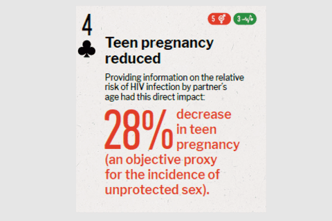 Strategy researched Providing information on the relative risk of HIV infection by partner’s age Impact achieved Country of study Kenya Research methodology RCT with 328 primary schools Journal Journal paper title and link Excerpt from Abstract "Providing information on the relative risk of HIV infection by partner's age led to a 28 percent decrease in teen pregnancy, an objective proxy for the incidence of unprotected sex. Self-reported sexual behavior data suggests substitution away from older (riskier) partners and toward same-age partners. In contrast, the official abstinence-only HIV curriculum had no impact on teen pregnancy." |