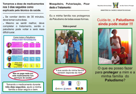 C-Change, a project funded by the United States Agency for International Development (USAID), produced a set of flyers, posters, and radio spots designed for parents and health workers on malaria prevention and treatment in Sao Tome and Principe. The materials focus on promoting the use of insecticide treated nets, , indoor residual spraying, care-seeking, and drugs/treatment knowledge. The materials were produced as part of a programme in which C-Change worked with the National Center for Endemic Diseases (CNE) of the Ministry of Health and the Brazilian Corporation from 2008 to 2011 to strengthen in-country capacity and activities for malaria social and behaviour change and communication (SBCC) programmes. C-Change organised several workshops and provided ongoing technical assistance to strengthen the capacity of local health personnel on SBCC concepts, such as pre-testing and audience segmentation. Following several rounds of pre-testing and revisions, this set of materials were produced in time for Malaria Day, April 25, 2011.