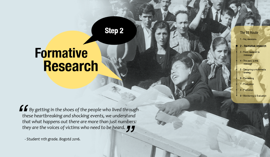- Colombia: A central component of the formative research for Romper el Silencio ("Breaking the Silence"), developed by Imaginario and its partners in the context of 60 years of armed conflict, was identifying global edutainment leaders who have designed strategies in contexts of social crisis and upheaval. Then, 20 focus groups and six in-depth interviews were carried out with adolescents aged 12 to 14, along with parents and teachers, from the 10 macro-regions established by the Truth Commission. A total of 138 people from all socio-economic strata, of different political tendencies, direct victims of the armed conflict or not, participated. Based on the findings and recommendations, it was decided that the central focus of the strategy would be an invitation to the country to Break the Silence. Each component would then work to open spaces for dialogue and generate informed debate and historical critical thinking about truth, justice, reparation, and new strategies of non-violent conflict resolution.