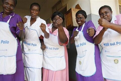 World Polio Day website (no longer online), September 23 2013; World Polio Day: Making History - Toolkit (no longer online; Minuteman News Center, October 17 2012 - accessed on September 23 2013; "Rotarians Active in Supporting Polio Eradication on World Polio Day", by Dan Nixon, Rotary News, July 23 2013 - accessed on September 23 2013; and GPEI website and 2016 World Polio Day Toolkit [PDF] - both accessed on October 24 2016. Image caption/credit: Immunisation health workers at Kisenyi Health Center IV in Kampala, Uganda, take on polio, World Polio Day, October 2012. (Stuart Ramson/UN Foundation)